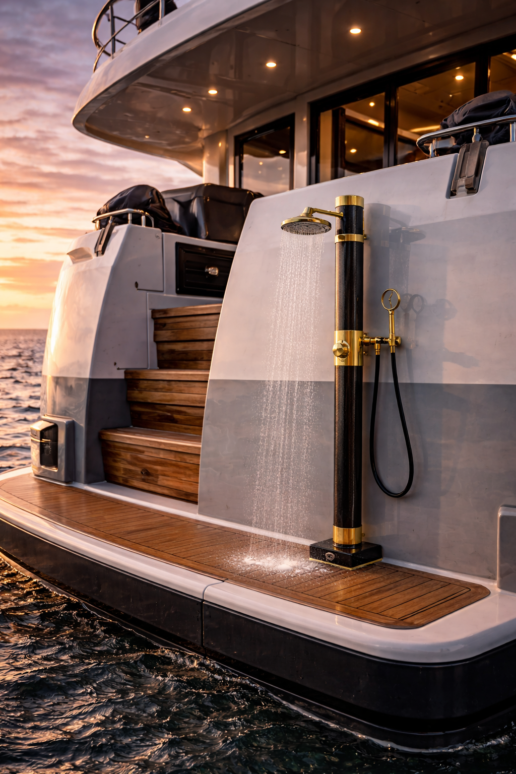 Doccia esterna bespoke progettata come elemento architettonico verticale per yacht di grandi dimensioni.