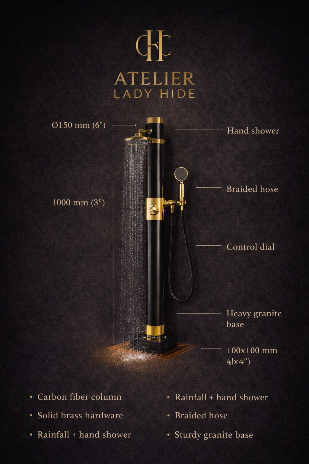 La colonna a tutta altezza garantisce comfort reale per l'utilizzatore in posizione eretta, integrando funzione, materiali ad alte prestazioni e un linguaggio formale iconico coerente con Atelier Lady Hide.